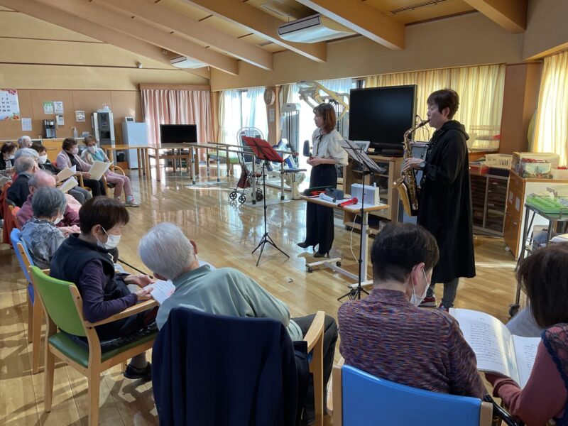 オカリナやサックスをはじめ、演奏中に音色を変えられる楽器では、バイオリンやピアノ(尺八にもできるそうです)の音色にも変化させながらの演奏が披露され、利用者様も興味津々で聴き入っておられました。
